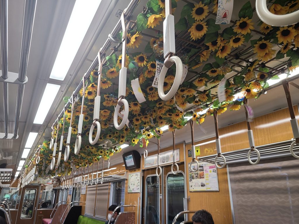 撮影時は8月お盆休み期間中でしたので、車内はひまわりで装飾されていました。涼しげですね。