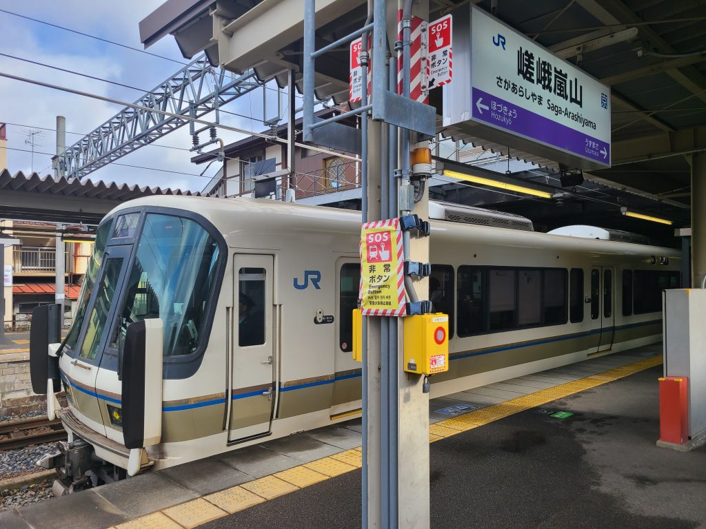 二条駅を出発すると線路は西方面に向きをかえて、山がせまってくると嵯峨嵐山駅に到着します。嵐山観光の拠点となる駅です。普通電車は毎時1本がこの駅までとなっています。
