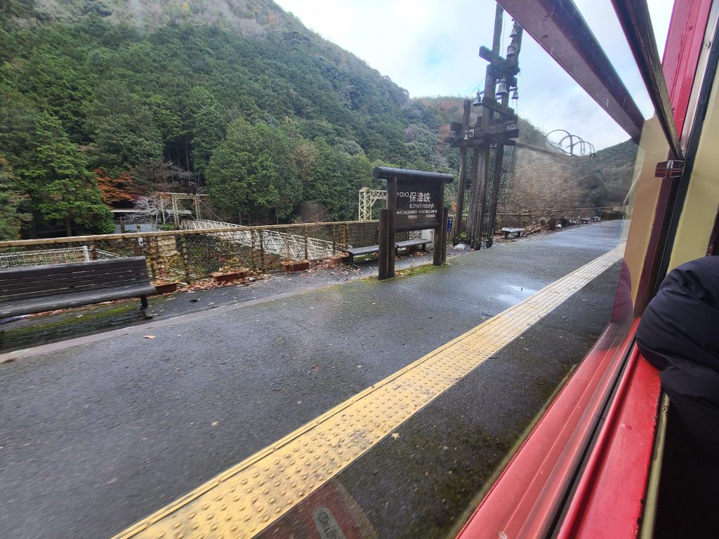 京都市内へ戻る場合は、再度トロッコ列車で戻るか、保津川下りの船に乗るか、右側の写真のようにJR山陰本線の最寄り駅である馬堀駅まで行ってJRに乗車するかになります。