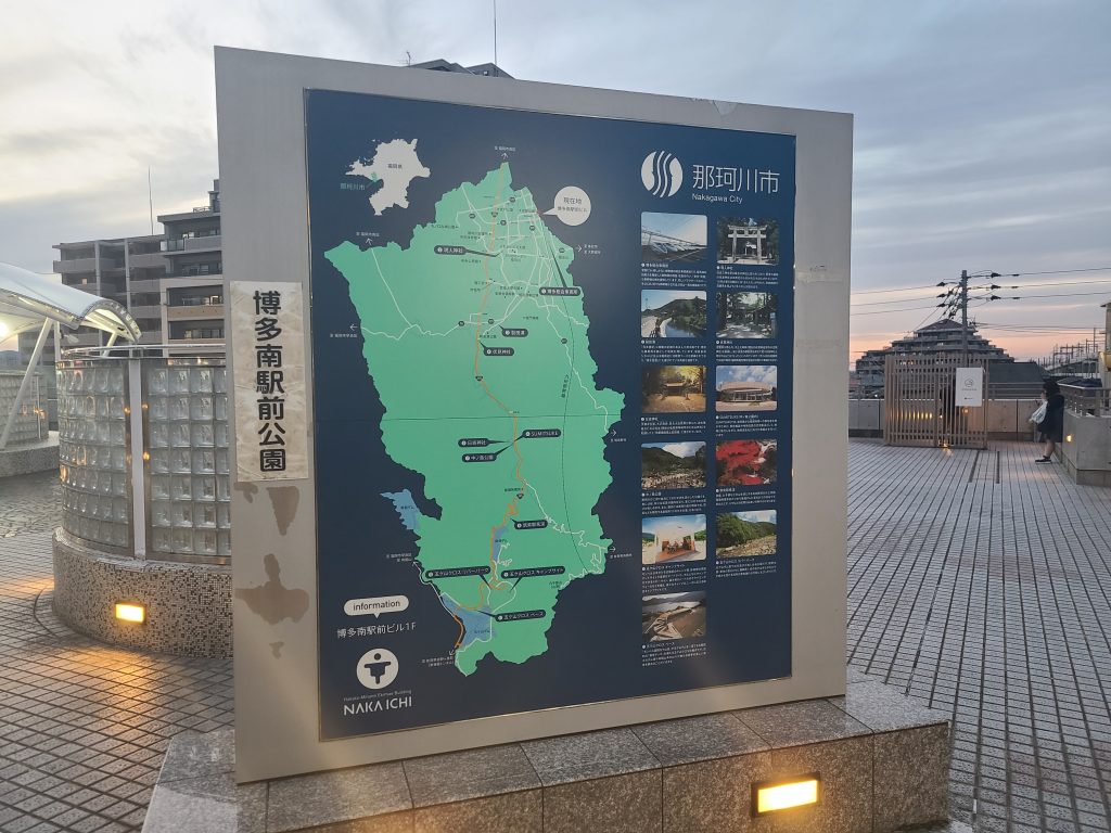 写真は博多南駅前広場にある那珂川市の案内図です。博多南駅はこの地図の一番右上にあたります。市の一番北にあたる場所となります。
