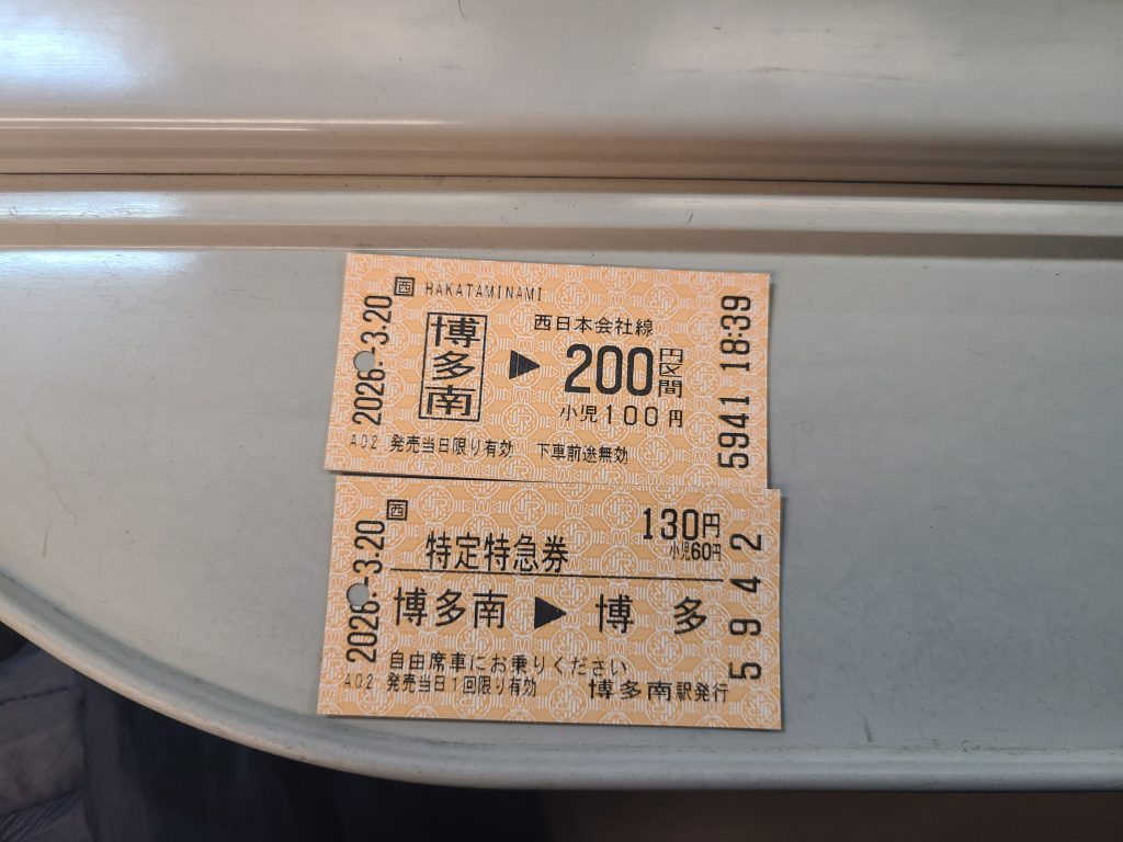 博多南線(博多南⇒博多)の切符です。博多南駅に券売機で切符を購入すると、写真のように乗車券と特定特急券が発行されました。