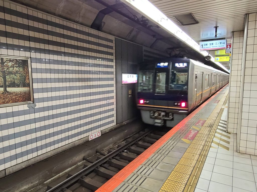 運行形態としては、東は学研都市線方面に、西は宝塚線方面に区間快速(朝夕は快速)と神戸線方面に普通が直通していて、それぞれ15分間隔で運行されています。それらが交互に入り東西線内は7.5分間隔となっています。