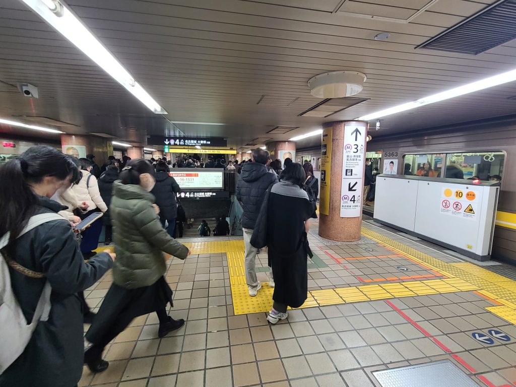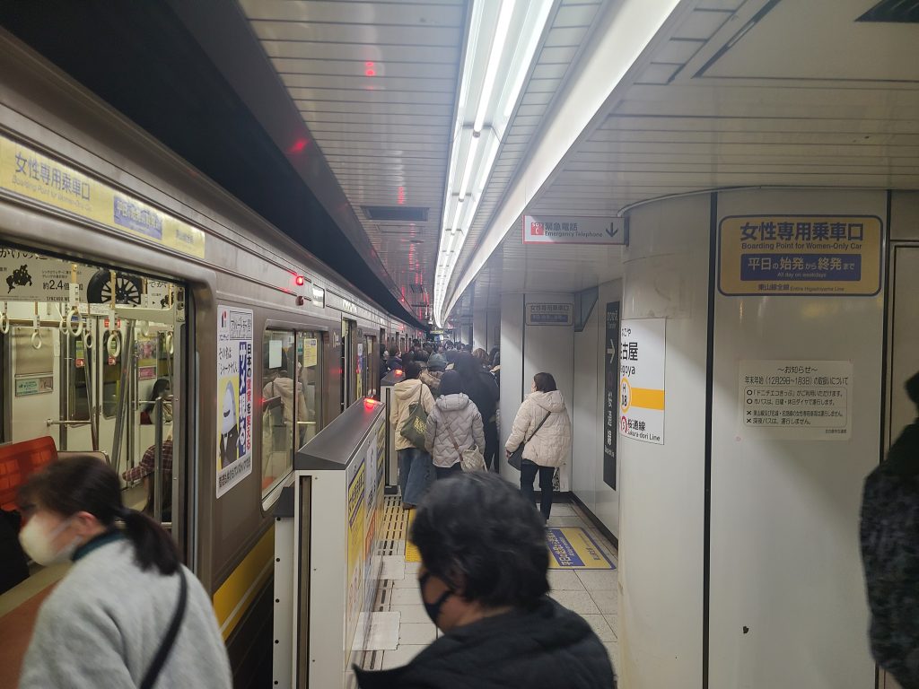 東山線は名古屋市営地下鉄で最初に開業した路線であり、建設当時の名古屋市の財政事情もあって、建設費を抑制するため地下区間ではトンネル断面を小さくなっているのが特徴です。下の栄駅の写真と合わせてみただけると感じられたかもしれませんが、駅の雰囲気は全体的に古く、ホームや通路が狭い箇所が多いです。名古屋ー伏見ー栄間は名古屋市営地下鉄の中で最混雑区間ですが、そのためより混雑している印象となります。