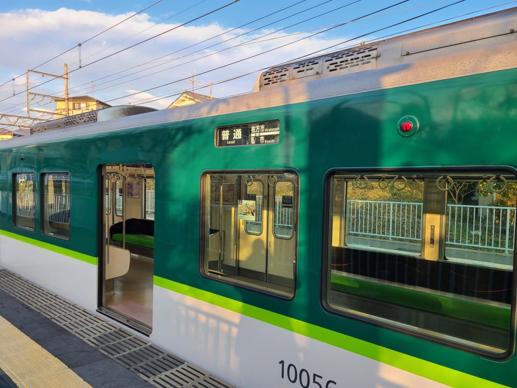 交野線で活躍するのは京阪10000系を中心とした車両。4両編成のコンパクトな姿が沿線の街並みによく馴染んでいます。