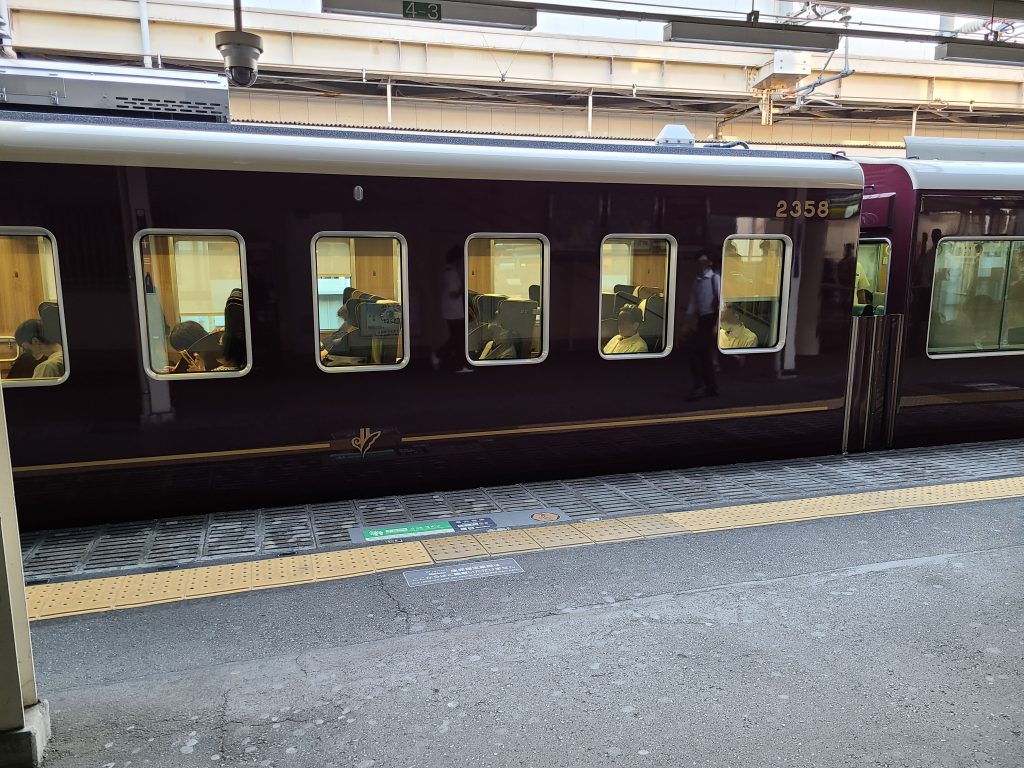 土休日ダイヤ実施日に大阪梅田駅 – 京都河原町駅間で1日4往復運行される観光客の利用を想定した列車で、専用車両での運転ですが、乗車券のみ(追加料金不要)で利用できるのが魅力です。途中停車駅は、十三駅・淡路駅・桂駅・烏丸駅で、特急より少なくなっています。