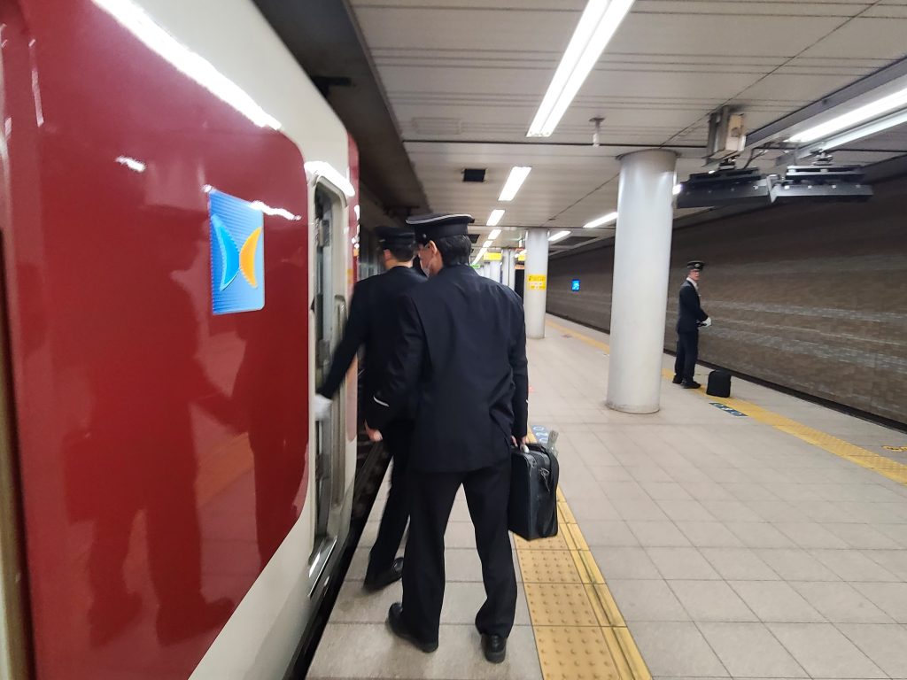 近鉄の乗務員と阪神の乗務員が交代しているところです。