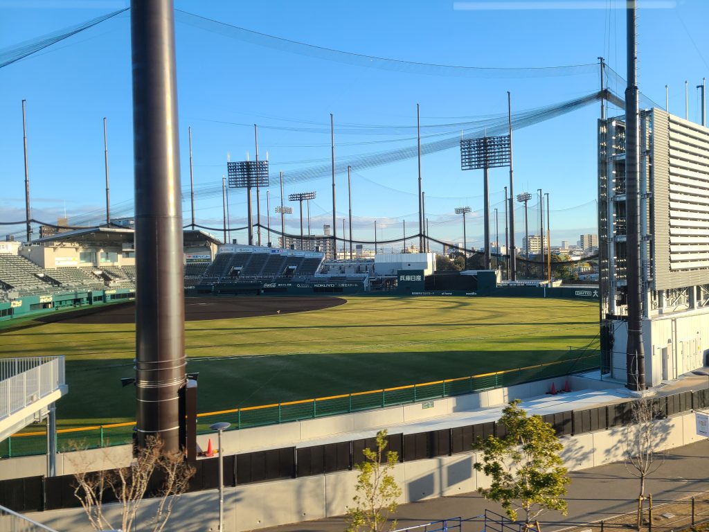 尼崎駅を出発し大物駅を過ぎると、すぐ左側に阪神タイガースの2軍の本拠地「日鉄鋼板SGLスタジアム尼崎」が見えます。タイミングがあえば阪神タイガースの2軍戦の試合が見えたり、タイガースの選手が練習している風景を見ることができます。